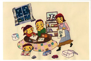 ●普段の家での一こまかと思うのですが、体が暖かくなるような正月らしい絵です。(米嶋) ●不思議な雰囲気を持った絵ですが、何となくイメージは伝わるのですが、(メッセージ)がないのが残念です。もうひと工夫あれば良いのですが。(田中) ●外は雪でも温かいご家族の空気が感じられます。(早川) 浅田順子さん受賞の知らせを聞き、家族で喜んでおります。毎日の育児は、すぐに子どものケンカが始まったりでドタバタですが、年賀状のような家族のほっこりの時間を大切に、一年を過ごしていきたいと思いながら描きました。