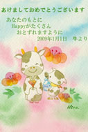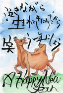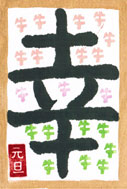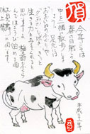 ●丑の文字を家に見立てた発想と絵が楽しい雰囲気を出していますね。(田中) ●ご家族それぞれの丑年の豊富と共に暖かい家庭の雰囲気ににっこりしてしまいます。(早川) |