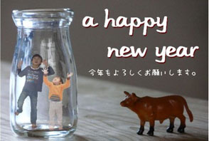 毎年年賀状は気合を入れているので、11月ごろから案を考えるのですが、今年は3案思いつき最終的にこれになりました。牛→牛乳→牛乳瓶?と連想ゲームのように考えていきこの形になりました。子供たちにこのポーズをさせるのが一番難しかったです。 |