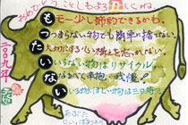 ●じいちゃん、ばあちゃんからの想い(お説教)を伝える。 その時は嬉しくないかもしれないが、ジワジワ伝わることを期待させる年賀状。新年、道徳を学ぶことから始めることができるのは有難いことです。(佐藤) ●私も子供の頃に言われ続けました。今の子に言っても仕方ないのかもしれませんが、本当に勿体ないのはきっとモノではなく、こうした知恵なのだと思います。(田中) ●おじいちゃん、おばあちゃんの年賀状で自分の行動を振り返らなくてはならなくなったお孫さん。じっくりしっかりと「もったいない」精神が伝わる期待を感じます。(早川) |