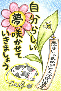 ●雰囲気がやわらかいですね。花を咲かせるというと花咲かじいさんか、喜納昌吉しか浮かばないのは自分の発想力の貧困さでしょうか。(田中) ●のんびりとした牛の表情に癒され、ほっこりとした気持ちでがんばろうと思えるメッセージです。(早川) 寺川初美さん驚きと嬉しさでまだ胸の奥がドキドキ鳴っております!