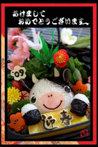 吉田由理さんキャラ弁(キャラクター弁当)を作るのが趣味で、干支の丑や正月飾りを食べ物で作り、お弁当に詰めました。送った方にもすごい!と褒められました。お弁当のみの製作時間は1時間半です。