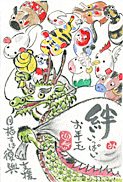 ●想定ターゲット●友達、親戚、お世話になった方々 ●アピールポイント● 昨年の字「絆」をテーマにしました。龍の持つ宝玉はみんなを笑顔にするパワーを持っています。受け取った方に福がくるように、「一富士二鷹三茄子」「松竹梅」の縁起物も描きました。 ●審査員コメント●デザイン、構成、メッセージ性等、どれをとっても素晴らしい作品です。更に絆が入り、受け取った方が笑顔になれます。(株式会社ワコム 米嶋) ●詰め込みすぎじゃないかと思うほど、細かく描かれています。上手すぎると印象度は逆に減ったりしますが、非常にバランスの良い、構図と絵です。(田中) ●とても手の込んだ力作ですね。日本の正月らしくおめでたい内容が散りばめられてるのが一目でわかります!(黒田) ●線に味がありますね。(梶谷) ●縁起のいい物がちりばめられ、とても楽しくなる1枚だと思います。(堀) ●たくさんのキャラクターが細かく描き込まれていて、楽しい年賀状と感じました。(高置) |