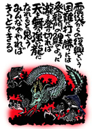 nekoさん ●想定ターゲット●お爺さんに送りました ●アピールポイント● 年の変わりめを描くため、去年の干支である兎と、今年の干支である龍を両方いれました。自分の完全創作なのが、唯一、アピールポイントです。 ●審査員コメント●うさぎから辰という発想はよくあるパターンですが、デザイン性が高いプロの作品ですね。(田中) ●描写が細かく、非常に上級な作品だと感心しました。(黒田) ●世界がありますね。(梶谷) ●繊細なタッチのイラストに色合いもマッチして、独特の雰囲気がいいです。(堀) |