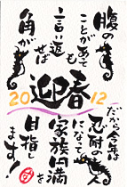 新庄すが江さん ●想定ターゲット●長年の友に ●アピールポイント● 今年は文字手紙に挑戦!長年の友に笑い心を詰め込んで、一生忘れられぬ年賀状を……。 ●審査員コメント●文字だけで表現しつつ、さりげなく絵が入っていてあたたかみのある年賀状ですね。(田中) ●特徴のある字で強いメッセージを感じます(米嶋) ●コメントに合わせて辰のイラストに表情を持たせると、もっと楽しさを表現できたのでは。(井須) ●言いたいことがちゃんと干支の「辰」が入ってて、くすっと笑ってしまうところが素敵な作品だと思いました。(黒田) ●干支とかけたものはよくありますが、干支入りの文にしたことで上手く1つの絵になりメッセージを伝えていると思います。(泉水) ●タツノオトシゴが上手く文字の中にはまっていて、バランスがいいですね。(堀) ●力強くて印象的な文字だと感じました。家族円満にはやっぱり忍耐なんでしょうね・・・。(高置) |